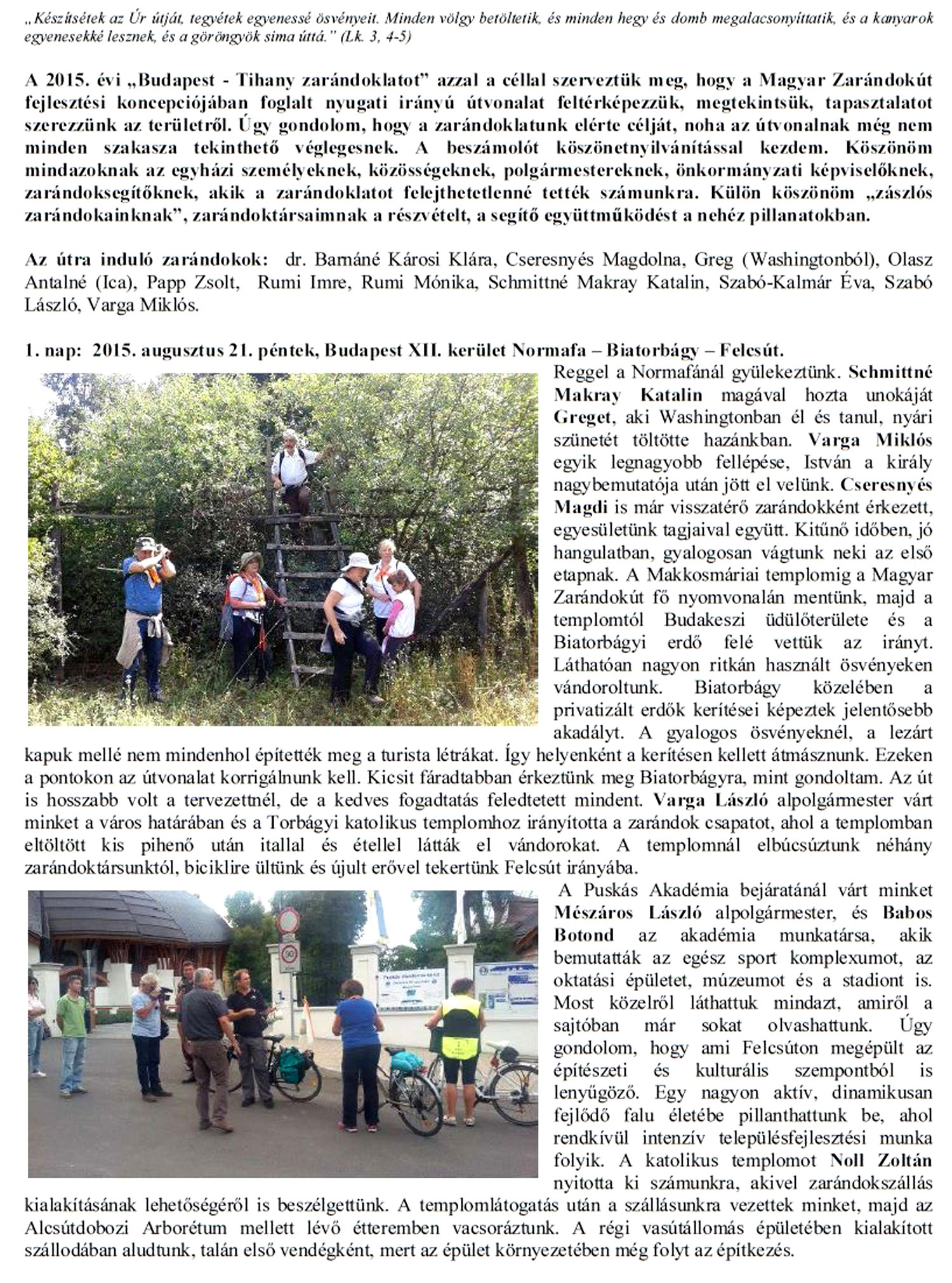 2015. évi „Budapest - Tihany zarándoklat” köszönetnyilvánító beszámoló