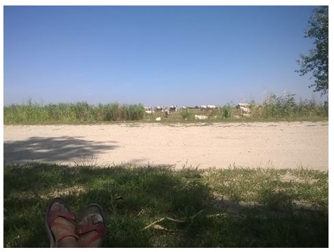 Kora hajnalban indulok, még sötétben, mivel a tervezett táv 38 km, a Kiskunsági Nemzeti Parkon keresztül, 40 fokos hőségben. A Dabas határában történtekre nagyon nem vagyok büszke, de ma már jókat kuncogok rajta, mindenesetre csak az unokáimnak fogom elmesélni nagyjából 100 éves koromban. A lényeg: egy idő után visszakerültem a zarándokszálláshoz, ahol jót mulattam magamon, és B terv gyanánt a műúton jutottam el a borzaspusztai romtemplomig. A csatorna partján majd’ minden horgásszal váltok pár szót. Ürbőpusztánál a kaszált réten keresztül vinne a jelzés, de én kötöm az ebet a karóhoz, a töltésen haladok tovább, és a hídnál is találok jelet. Hálás szívvel gondolok a jelek felfestőire, mindenkire gondolnak! A gátőrházhoz közeledve végre találok egy nagy árnyas fát. Jobbra tőlem szürkemarhák, balra pedig bivalyok vonulnak a vízpartra délidőben. A fájdalom, a hőség, a szomjúság gondja pillanatok alatt eltörpül, csak átadom magam a hangulatnak, még alszom is úgy negyedórát. Ott, a fa alatt ülve próbálok ráckevei szálláshoz jutni, sikertelenül. Az utolsó hívásnál már kétségbeesetten kérdem: Tessék mondani, egész Ráckeve tele van??? De végre belátom, hogy nekem most nem kell odáig mennem. Felhívom a Hajós kastélyt, ahol azonnal fogadnak, és másnapra is lefoglalom a szállást a Tassi zsilipnél, a halászcsárdában. Arra a napra bőven elég volt az a 26 km (plusz még néhány, ugye, a hajnali órákban…). Délután Évike a dabasi faluházból felhív, hogy érdeklődjön, sikerült-e túlélnem a napot, és a ráckevei zarándokszállásról is visszahívnak, hogy Szigetbecsén találtak nekem szállást, ha esetleg szükség lenne rá! Csodálatos, hogy ismeretlen emberek mennyi jóindulattal tudnak lenni irántam, nem ez az utolsó alkalom, hogy ezt tapasztalom az út során! De akkorra már a Hajós kastély vendégszeretetét élvezem. Délután pihenek egy jót a hűvös szobában, pontban 6-ra, az ígért időpontra kész a remek vacsora. Estefelé, kinn a kertben üldögélve az történik, hogy nem történik semmi, és ez valami fantasztikus! Kilúgozódnak a gondolataim, egyszerűen csak élvezem a létezés örömét. Komolyan hiszem, hogy van abban a helyben valami. J