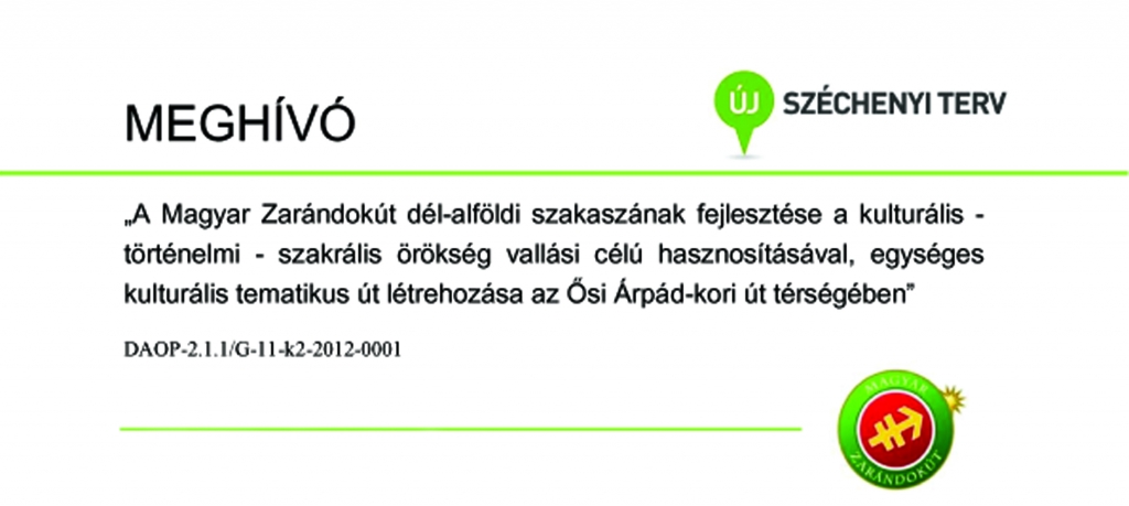 „A Magyar Zarándokút dél-alföldi szakaszának fejlesztése a kulturális – történelmi – szakrális örökség vallási célú hasznosításával, egységes kulturális tematikus út létrehozása az Ősi Árpád-kori út térségében” című pályázat keretében Homokmégy településen megvalósuló projektrész záró rendezvénye 2014. október 22-én kerül megtartásra.
