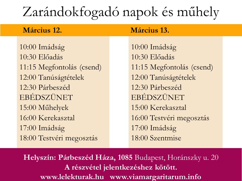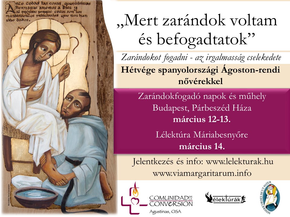 Szeretettel hívunk Benneteket március 12-13-án a Párbeszéd Házába (1085 Bp., Horánszky utca 20.) Zarándokfogadó napokra és műhelyre, melyet spanyolországi Ágoston-rendi zarándokfogadó nővérek tartanak, március 14-én pedig Lélektúrára, mely Veresegyház és Máriabesnyő között kerül megrendezésre szintén az ágostonos nővérek részvételével.